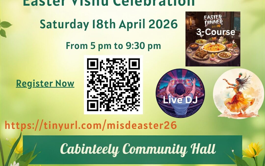 Malayalees In South Dublin in association with Social Space Ireland celebrate Easter & Vishu on Saturday 18th April 2026 from 5 PM to 9.30 PM at Cabinteely Community Hall.